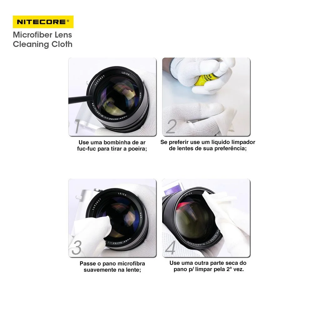 O kit com 10 panos de microfibra Nitecore é ideal para limpeza delicada de lentes de câmeras, smartphones, tablets, notebooks, relógios, joias e óculos. Cada pano, medindo 10 × 10 cm, foi desenvolvido para remover sujeira sem riscar, manchar ou soltar fiapos, preservando o revestimento das lentes com máxima segurança. Fabricado em microfibra de alta qualidade, garante eficiência e proteção durante o uso, adequado para diversos dispositivos tecnológicos.